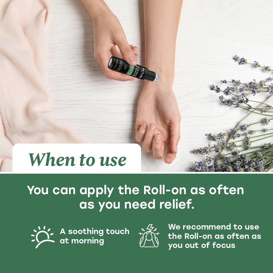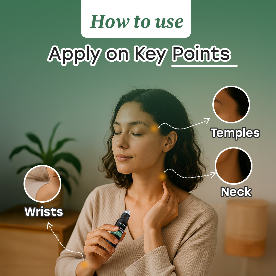 - Apply on temples, wrists, and behind the ears whenever you feel stressed or distracted