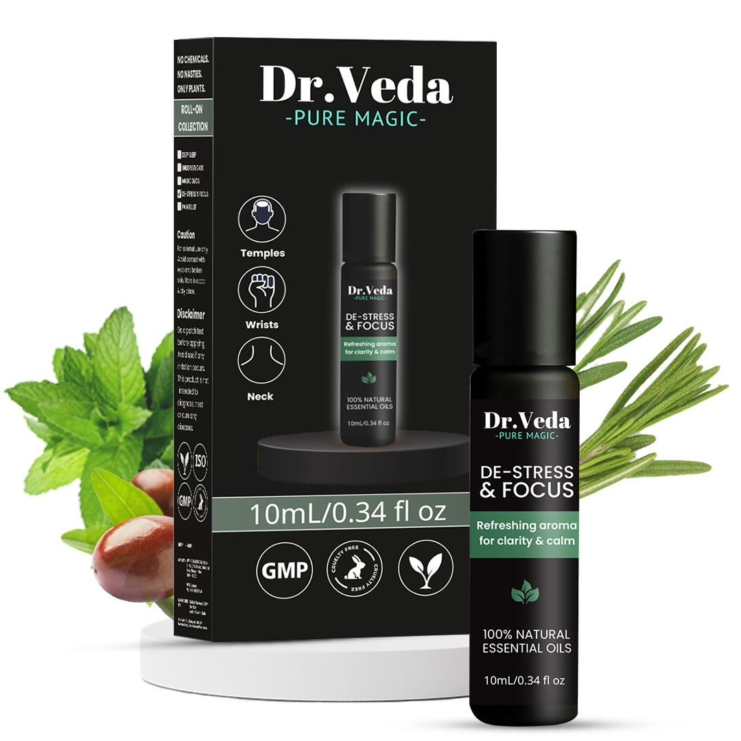 Find calm in the chaos with Dr. Veda Destress & Focus Roll-On. Made with refreshing essential oils and Ayurvedic herbs, this blend reduces stress, clears your mind, and improves focus — naturally.